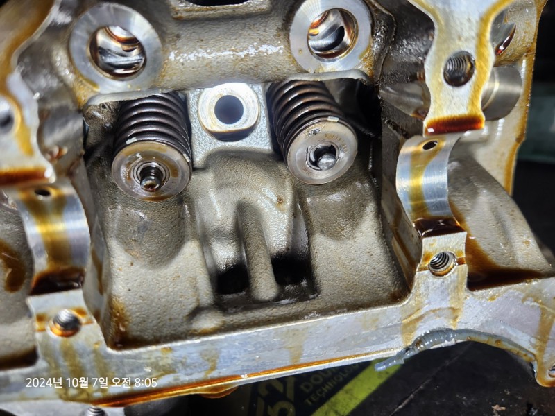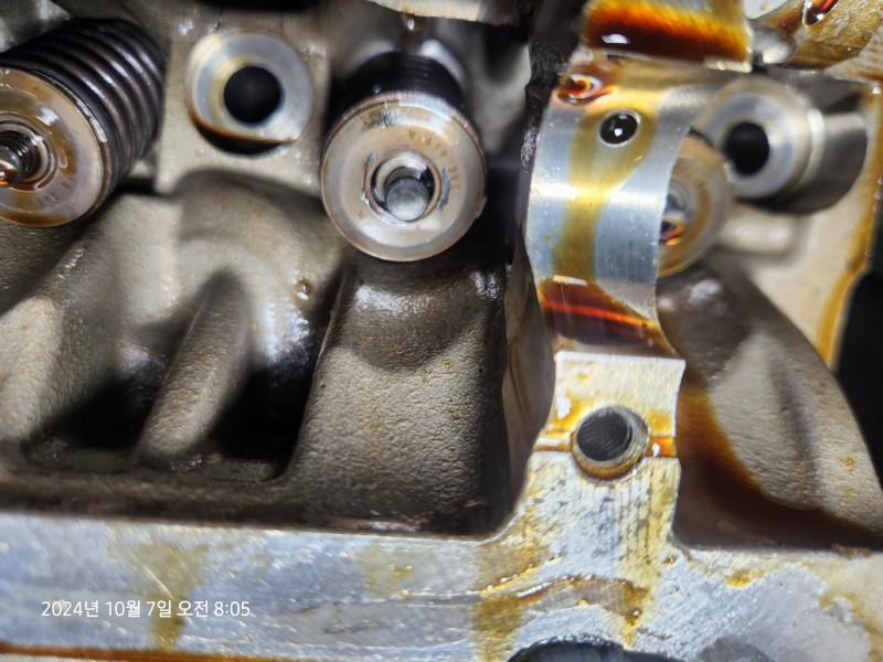 엔진분해결과 흔치않은 사례이지만 밸브코터가 하나 없습니다.물론 피스턴두 오일을잡아먹구  있구요